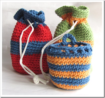 Thanks to the how-to & pattern at CreativeJewishMom, I whipped up a couple of crochet gift bags the other evening. I left out the decorative edging, and used bright primary colors for two little boys: